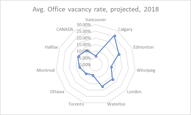 On the other hand, commercial real estate markets in Canada are continuously setting new records and retain momentum, recording the highest CRE investment volume in the nation’s history in 2017 [All data in this section according to CBRE 2018], at $43 bn, while the average cap rate [Capitalization rate, the ratio of net operating income to property asset value] fell slightly, to a low of 5.69%, but still with a solid 365 bp spread above 10-yr bond yields. But these figures again conceal a rather inhomogeneous reality, where the projected average national office vacancy rate 2018 may be settling at a comfortable level of 12.7%, but with wide regional deviations (see. Figure 02).