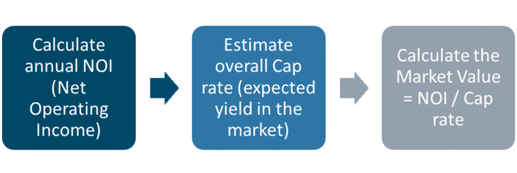 - cap rate (-> from comparable market valued objects, or through more detailed weighted average methods in use) and
