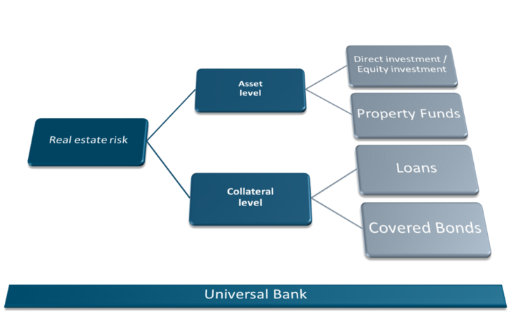 Real estate risk can be realized both on the asset or on the collateral level. Direct or indirect investment into property or shares in real estate investment funds present the more obvious exposure, while real estate as collateral should be regarded as equally important, be it as primary collateral from the lending process, or as a dependency on the collateralization level in financial instruments such as covered bonds (see Figure 03).