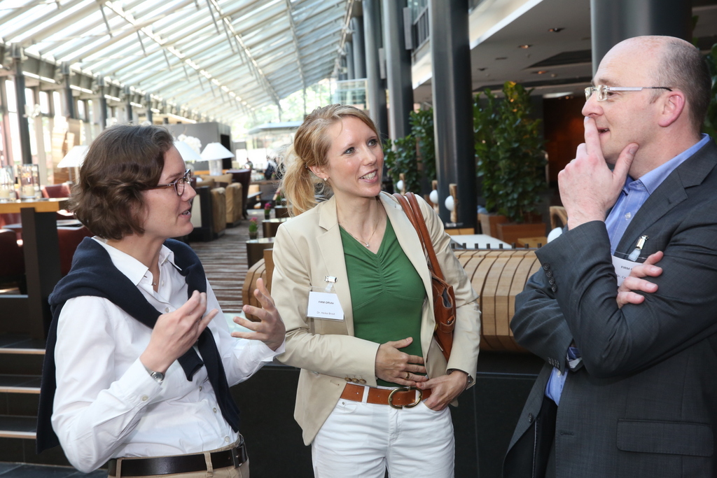 Dr. Natalie Packham und Dr. Heike Brost (beide Frankfurt School of Finance & Management) im Gespräch mit Dr. Carsten Lehr (Geschäftsführer der "Bundesrepublik Deutschland – Finanzagentur GmbH")