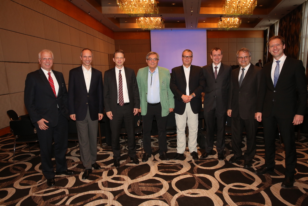 Der FIRM-Vorstand (von links nach rechts): Prof. Dr. Udo Steffens (Frankfurt School of Finance & Management), Bernd Loewen (KfW Bankengruppe), Christian Sewing (Deutsche Bank), Wolfgang Hartmann, Marcus Kramer (BayernLB), Dr. Thomas Poppensieker (McKinsey & Company), Prof. Dr. Wolfgang König (House of Finance, Goethe-Universität), Dr. Stephan Bredt (Hessisches Ministerium für Wirtschaft, Verkehr und Landesentwicklung).
