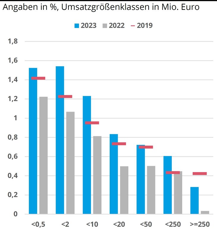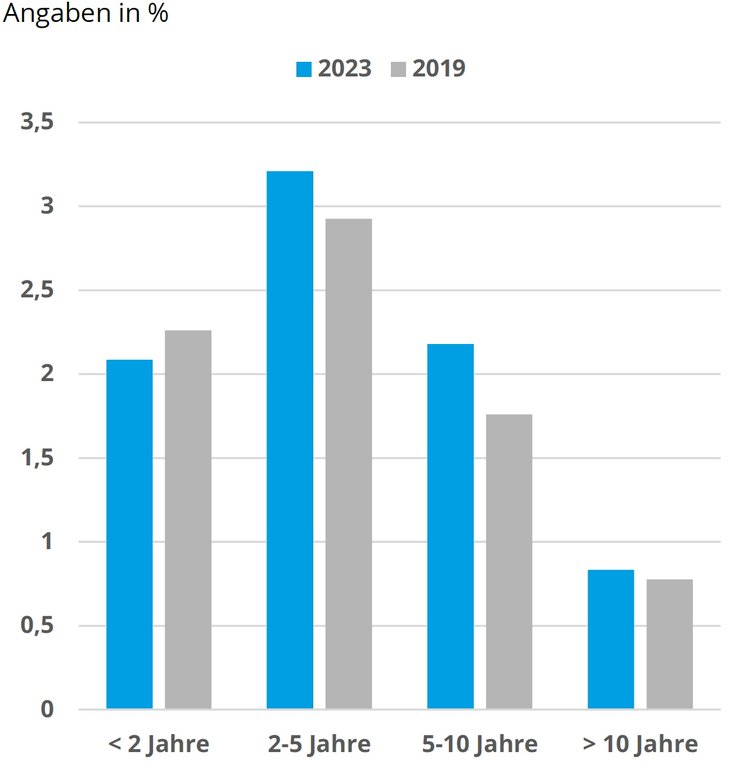 Während sich Alteingesessene Betriebe (> 10 Jahre) am stabilsten erwiesen und erneut die niedrigsten Ausfallquoten aufwiesen (0,83 %), gab es in Hinblick auf die Differenzierung nach Unternehmensalter dennoch eine ungewöhnliche Entwicklung zu beobachten. So wiesen etablierte Unternehmen (5-10 Jahre alt) im Vergleich zu Start-ups (unter 2 Jahre alt) eine höhere Ausfallrate auf. Für 2023 wurde demnach bei den etablierten Unternehmen ein Wert von 2,18 % ermittelt, gegenüber 2,09 % bei den Start-ups. Als einzige der untersuchten Altersklassen konnten Start-ups zudem 2023 eine niedrigere Ausfallrate zeigen als 2019 (2,26 %).