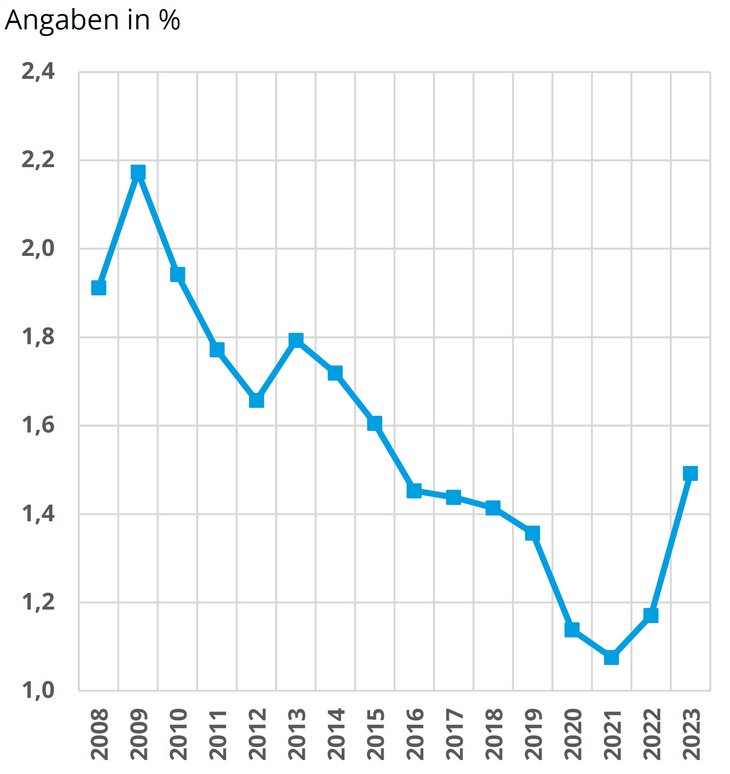 Creditreform Rating hat in einer aktuellen Studie die Risikosituation im deutschen Unternehmenssektor anhand der Ausfallraten, basierend auf einer Basel-konformen Definition von Ausfällen, für das Jahr 2023 untersucht. Dabei hat die Ratingagentur den höchsten jährlichen Anstieg bei der Ausfallrate von Unternehmen seit dem Beginn der Analyse im Jahr 2008 feststellen können. Im Jahr 2023 ist die Ausfallrate gemäß der obigen Definition von 1,17 % auf 1,49 % geschnellt. Es ist das zweite Jahr in Folge, in dem die Ausfallrate deutscher Unternehmen zunimmt. Damit liegt sie inzwischen auch über dem Stand vor Ausbruch der Corona-Pandemie (2019: 1,36 %).