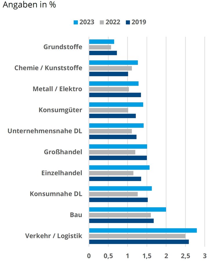 3. Die Wirtschaftszweige Verkehr/Logistik und Bau waren weiterhin die Branchen mit höherem Ausfallrisiko, während die Grundstoffindustrie das niedrigste Risiko aufwies. Der Einzelhandel verzeichnete den stärksten Anstieg der Ausfallrate. Im Vergleich zu 2019 zeigten die Grundstoff- und die Metall/Elektroindustrie sogar eine niedrigere Ausfallrate im Jahr 2023.