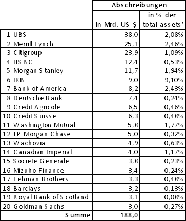 Abbildung 1: Die 20 Institute mit den höchsten Sub-Prime-Abschreibungen per April 2008 [Quelle: Bloomberg u. eigene Berechnungen]
