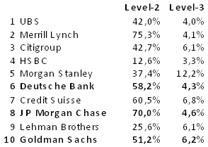Deutsche Bank, JP Morgan und Goldman Sachs haben zum Beispiel einen vergleichbar großen Anteil an Level-3-Assets deklariert. Bei den Abschreibungen sind sie bisher jedoch eher glimpflich davongekommen.