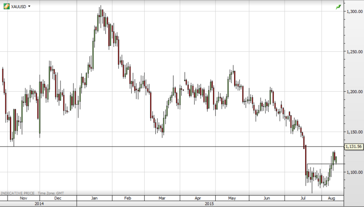 So one week ago, gold's potential best support came from the fact that many had turned against it, thereby leaving it exposed to short covering. This was exactly what happened on Tuesday when devaluation news from China hit the market. Not only did it raise the prospect of increased demand from Chinese investors seeking a hedge against falling currency. It also called into question the timing of when and after that, how much, the US Federal Reserve will be able to raise rates.