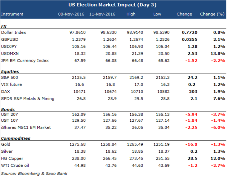 Perhaps it's best to kick off this weekly update by taking a look at some of the major market developments since Tuesday night, before polling stations began to close across the US. The single biggest development since the result became known was Trump's pledge to open up the public purse with over $500 billion earmarked for infrastructure projects branded as the "rebuilding of America".