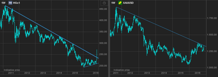Instead of seeing gold break the downtrend from 2011, it was instead copper which surged higher to record its biggest weekly gain in decades.