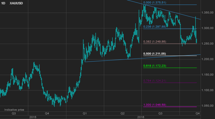 Gold's spectacular failure to hold onto its initial gains and the subsequent headwind from rising bond yields and dollar could see it once again test key support at $1,250/oz. A break below this level will put $1,211/oz into focus – this being the halfway mark of the rally seen over the past 11 months.