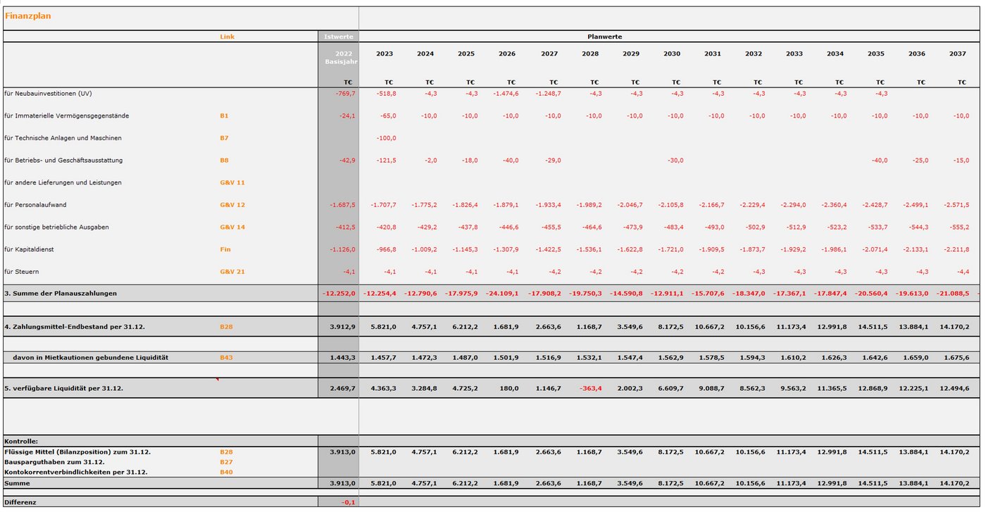 Nicht jeder Finanzplan genügt den Anforderungen als Risikomanagement-Instrument. Der hier zu Anwendung kommende vollintegrierte Finanzplan speist sich aus allen Bilanz- und G&V - Positionen und ist periodenübergreifend verknüpft. Wie aus der letzten Differenzzeile hervorgeht, ist er abstimmbar! Der unter Punkt 4 genannte "Zahlungsmittel-Endbestand per 31.12." muss dem Ausweis der Bilanzposition "Flüssige Mittel" entsprechen (die Rundungsdifferenz beträgt 0,1 T€). Erst diese Genauigkeit verleiht ihm Aussagekraft!