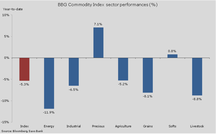 Industrial metals have been led lower by the rout in copper which according to Bloomberg has had its worst January in 27 years. The 14% fall this month to a 5.5 year low has made this bellwether metal one of the worst performers (together with crude oil).