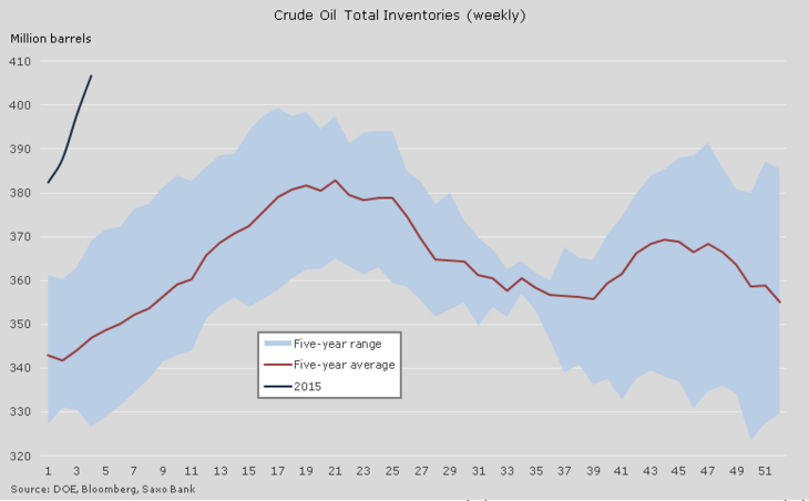 Inventory levels at Cushing, the delivery hub for WTI crude oil futures, has risen by more than 8 million barrels during the past four weeks while the amount of crude now in floating storage is expected to have exceeded 50 million barrels.