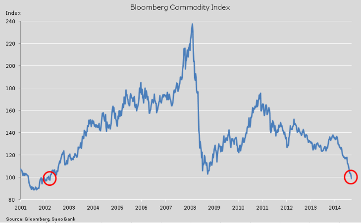 This index, which tracks the performance of 22 leading raw materials with a one-third exposure to each of the three main sectors of energy, metals and agriculture, has slumped to a 12.5 year low and in the process has wiped out much of the gains seen during the Chinese boom years at the beginning of this millennium.