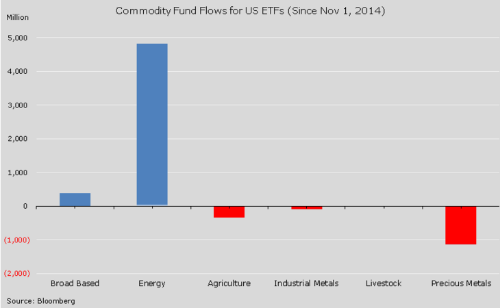 The 5% rise of the dollar against a basket of currencies also played its part in making commodities less attractive.
