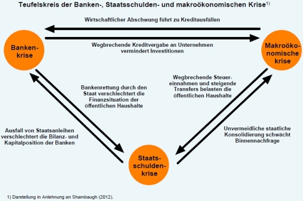 Abbildung: Teufelskreis der Banken-, Staatsschulden- und makroökonomischen Krise (Quelle: Sachverständigenrat zur Begutachtung der gesamtwirtschaftlichen Entwicklung: Nach dem EU-Gipfel: Zeit für langfristige Lösungen nutzen (Sondergutachten gemäß § 6 Absatz 2 Satz 1 des Gesetzes über die Bildung eines Sachverständigenrates zur Begutachtung der gesamtwirtschaftlichen Entwicklung), Wiesbaden, 5. Juli 2012, S. 1.)
