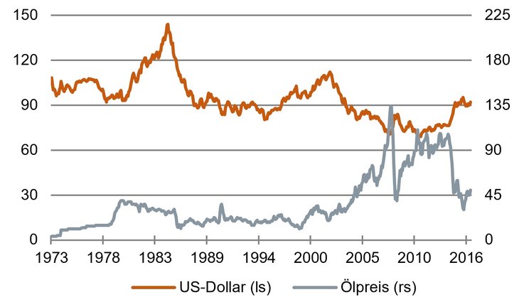 Wenn man aus der Grafik überhaupt eine Regel herauslesen will, dann ist es die, dass negative Korrelationen zwischen Ölpreis und US-Dollar insgesamt häufiger vorkommen als positive. Sie prägten die ersten Jahre nach dem Ölschock im Jahr 1973. Dann folgte eine lange Periode, in der der US-Dollar heftig schwankte, ohne dass sich dies aber stärker auf den Ölpreis auswirkte. Erst seit Anfang der Nullerjahre hat sich der Zusammenhang zwischen US-Dollar und Ölpreis wieder verstärkt. Nach den Berechnungen der Europäischen Zentralbank beläuft sich die Korrelation inzwischen auf -0,5 Prozent. Das ist statistisch signifikant, ist aber nicht außergewöhnlich hoch.