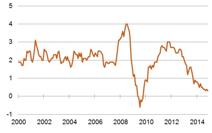 Auf dem Weg in die Deflation? Verbraucherpreise in % ggü. Vorjahr im Euroraum [Quelle: EZB]