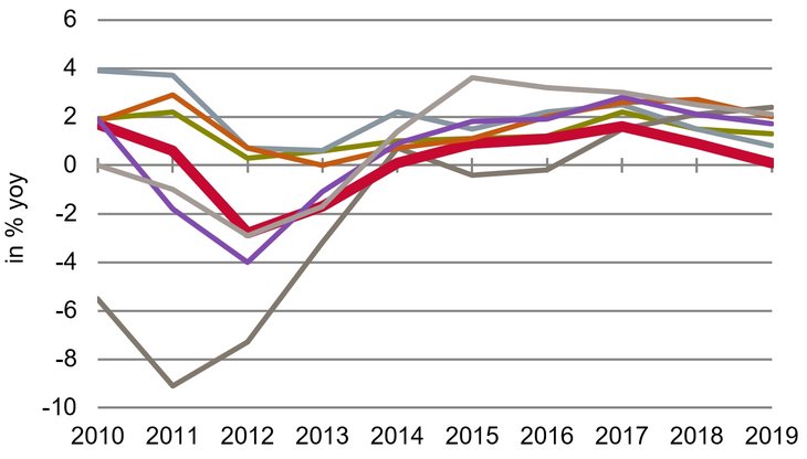 Ähnlich, wenn auch nicht ganz so krass die Entwicklung Deutschlands. Im Jahre 2010 war es noch der Musterknabe. Am Ende der Periode ist Deutschland weit zurückgefallen und rangiert nunmehr an zweitletzter Stelle vor Italien. Auf der anderen Seite steht Griechenland, das in diesem Jahr zusammen mit Spanien den Wachstumszug anführt.