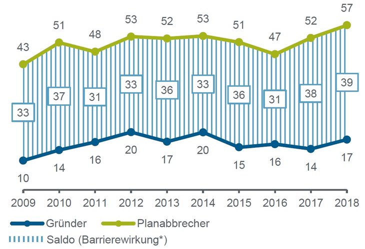 * Je häufiger ein bestimmtes Problem bei Abbrechern von Gründungsplänen im Vergleich zu tatsächlichen Gründern vorkommt, desto häufiger dürfte dieses Problem als Gründungsbarriere gewirkt und effektiv Gründungen verhindert haben.