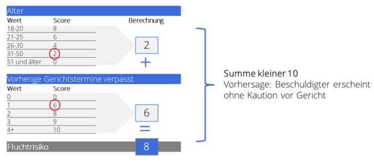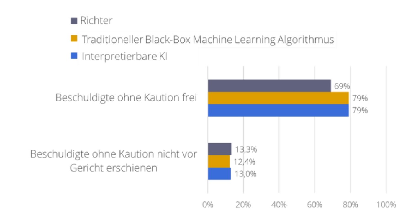 - Gerichtliche Entscheidungen: Der Algorithmus "Correctional Offender Management Profiling for Alternative Sanctions (COMPAS)" hat in den USA Millionen von Kautions- und anderen Gerichtsentscheidungen unterstützt. Eine Studie hat jedoch gezeigt, dass COMPAS unter Verwendung von über 130 Variablen die Rückfälligkeit nicht besser vorhersagt als Menschen ohne juristischen Hintergrund, die nur 7 Variablen verwenden. Darüber hinaus ist es aufgrund der Black-Box-Natur von COMPAS schwierig festzustellen, ob Minderheiten diskriminiert werden.