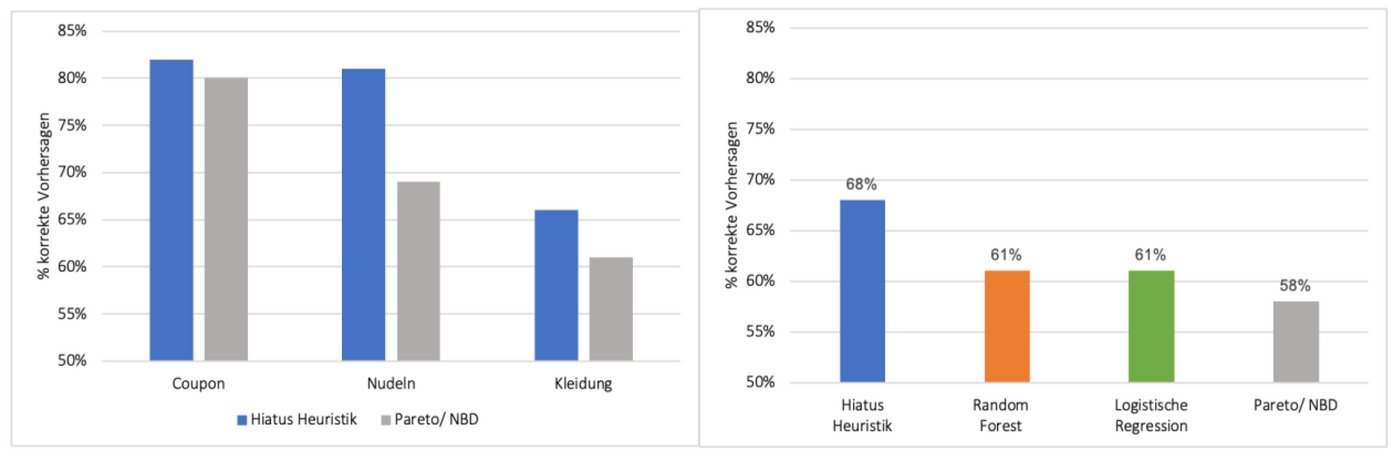 - Analyse des Kundenstamms: Um die Effizienz und den Erfolg eines Unternehmens zu verbessern, ist es wichtig zu wissen, welche Kunden angesprochen werden sollen (z. B. für Marketingkampagnen) und welche der bestehenden Kunden in Zukunft Käufe tätigen und welche nicht. Bereits 2008 haben zwei ehemalige Kollegen gezeigt, dass eine einfache Management-Faustregel ein mathematisches "Optimierungsmodell" aus dem Marketingbereich (Pareto/NBD-Modell) über drei Märkte hinweg schlagen kann (siehe Abb. 05, links). Das einfache Modell, die so genannte "Hiatus-Heuristik", wird von Vertriebsleitern in den unterschiedlichsten Branchen verwendet: "Wenn ein Kunde seit X Monaten keinen Kauf getätigt hat, stufen Sie ihn als inaktiv ein, ansonsten als aktiv." Wir haben uns kürzlich zusammengetan, um diese Analyse auf 61 (Einzelhandels- und Nicht-Einzelhandels-) Datensätze auszuweiten, wobei wir logistische Regressionen und wiederum Random Forests in unsere Vergleiche einbezogen haben. Auch hier konnte sich der transparente heuristische Algorithmus nicht nur gegen diese weitaus komplexeren Konkurrenten behaupten, sondern übertraf sie in all diesen Datensätzen und Anwendungen sogar erheblich (siehe Abb. 05, rechts).