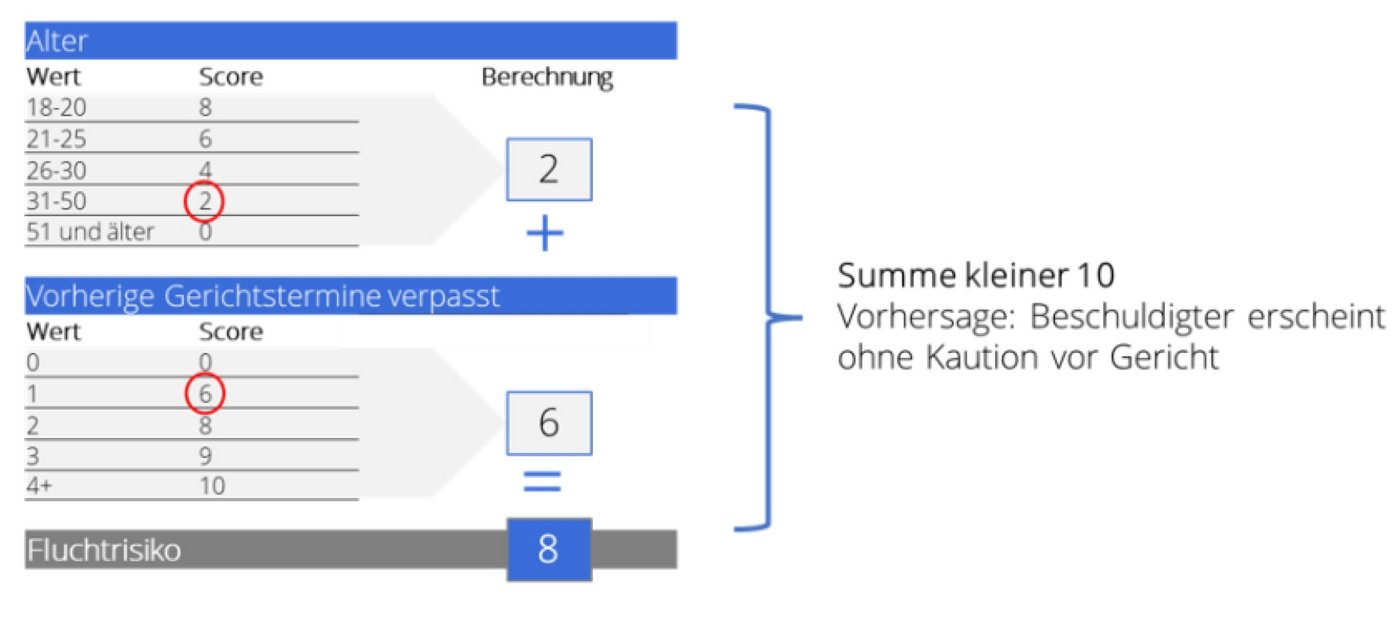 Abb. 03: Ein einfacher, transparenter Algorithmus zur Vorhersage der Rückfälligkeit. Der Algorithmus berücksichtigt nur zwei Faktoren (Alter und Anzahl der versäumten Gerichtstermine) und integriert diese mithilfe einer einfachen Bewertungsmethode