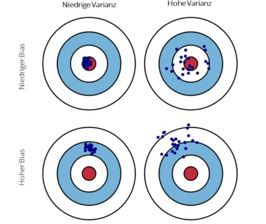 Abb. 06: Ein Bias (die beiden unteren Ziele zeigen hohen Bias) ist eine systematische Abweichung des geschätzten Durchschnittswerts vom wahren Wert (dem Bullauge) - denken Sie an ein Gewehr mit einem schiefen Lauf, das das Ziel immer um denselben vorhersehbaren Grad verfehlt. Die Varianz (die beiden rechten Zielscheiben zeigen eine hohe Varianz) ist die Streuung der einzelnen Werte (der Einschusslöcher) um ihren Durchschnitt - denken Sie an eine abgesägte Schrotflinte, die eine größere Streuung hat als eine mit einem längeren Lauf.