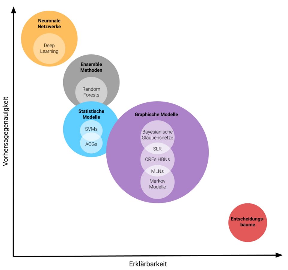 Abb. 02: Der Kompromiss zwischen Aufwand und Genauigkeit, der sich in den Kompromiss zwischen Erklärbarkeit und Genauigkeit umwandelt. Die (fehlerhafte) Annahme ist hier, dass Modelle mit geringerer Komplexität (z. B. Entscheidungsbäume unten rechts) eine höhere Erklärbarkeit, aber eine geringere Vorhersagegenauigkeit aufweisen [Quelle: DARPA, 2016]