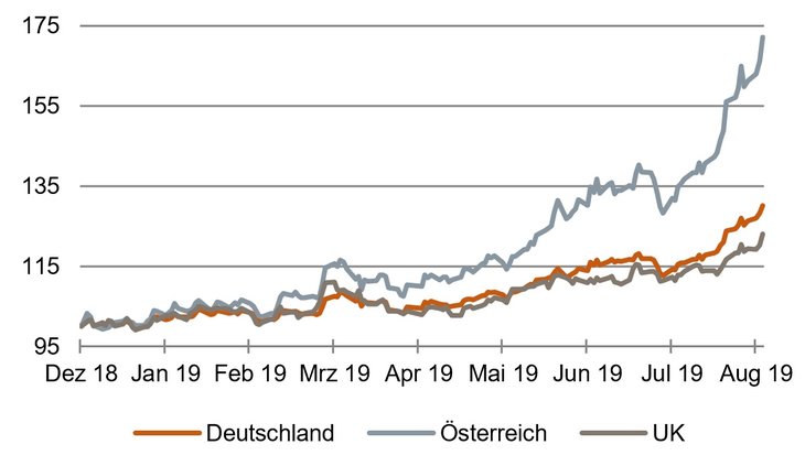 Rekordrenditen bei Bonds: 100-j. Bonds Österreich, 30-j. Bonds Deutschland, 50-j. Bonds UK; 31.12.18 = 100 [Quelle: Bloomberg]