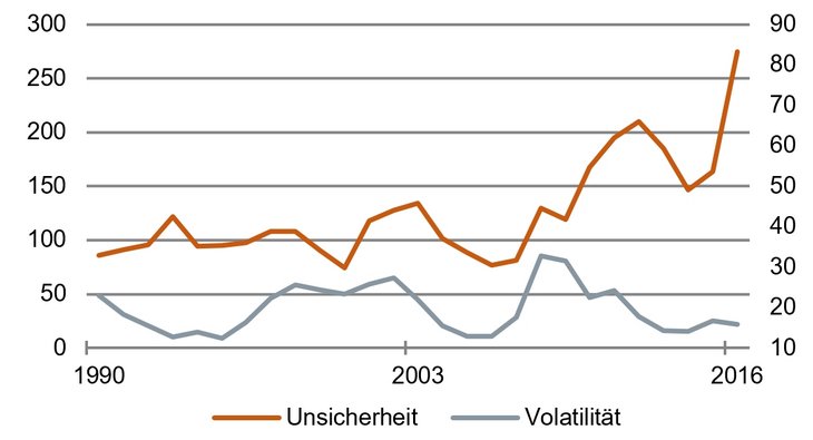 Seit 2010 hat sich das geändert. Die Unsicherheit stieg drastisch an, zuerst wegen der Eurokrise, dann wegen des Brexit-Referendums und der Wahl von Donald Trump. Gleichzeitig ging die Volatilität der Märkte aber zurück. Die Aktienkurse haussierten.