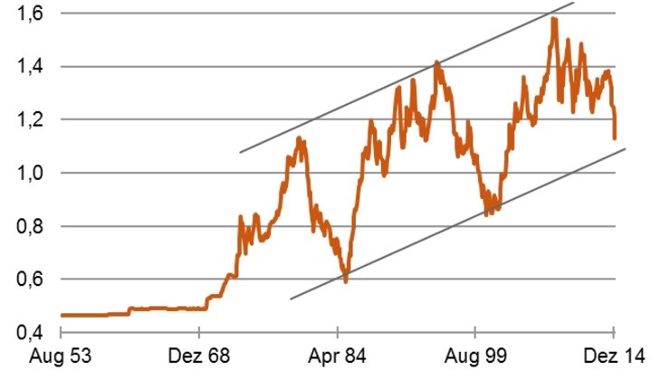Viertens: Seit Beginn der flexiblen Kurse gibt es drei klar voneinander getrennte große Zyklen. Der erste endete 1985 mit der Dollarhausse unter dem amerikanischen Präsidenten Reagan. Der zweite fand seinen Tiefpunkt um die Jahrtausendwende mit der Schwäche des Euros nach der Einführung der Währungsunion. Den dritten erleben wir gerade jetzt. Bemerkenswert ist, dass die Zyklen gemessen an den Tiefpunkten jeweils 15 Jahre auseinander liegen. Eine solche Regelmäßigkeit könnte auf eine tieferliegende Gesetzmäßigkeit hindeuten. Freilich sehe ich keinen ökonomischen Grund, dass es alle 15 Jahre zu einer Zuspitzung auf den Devisenmärkten kommen sollte. Vielleicht ist es nur Zufall, allerdings ein interessanter Zufall.