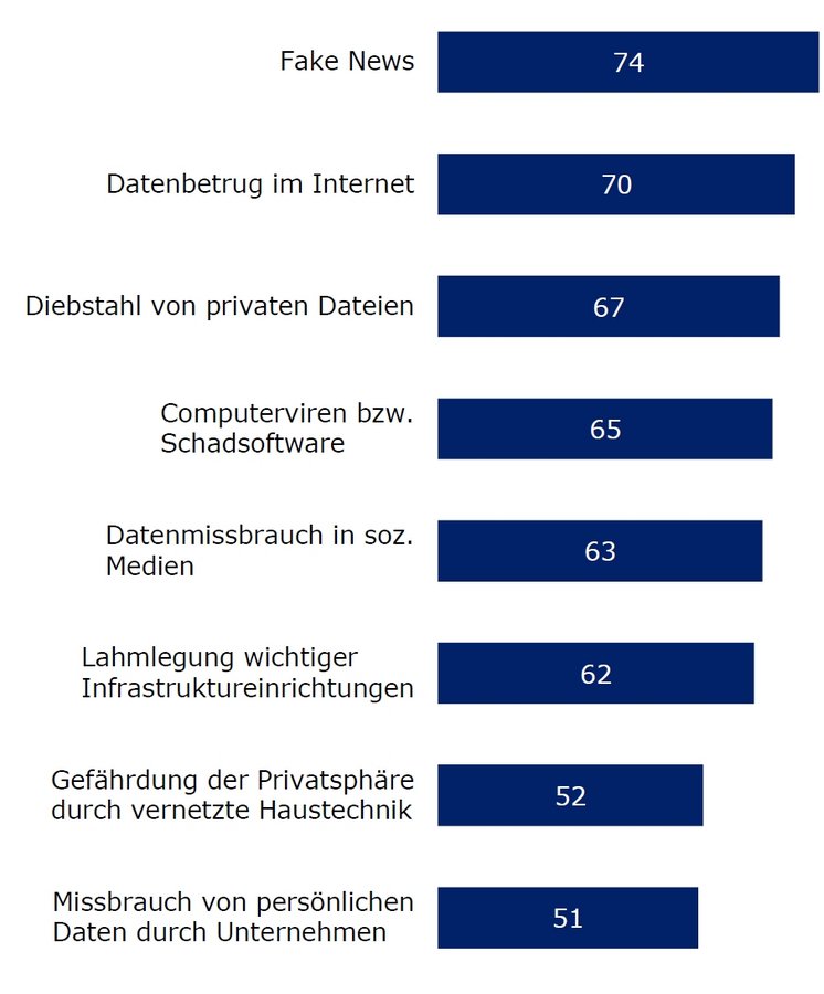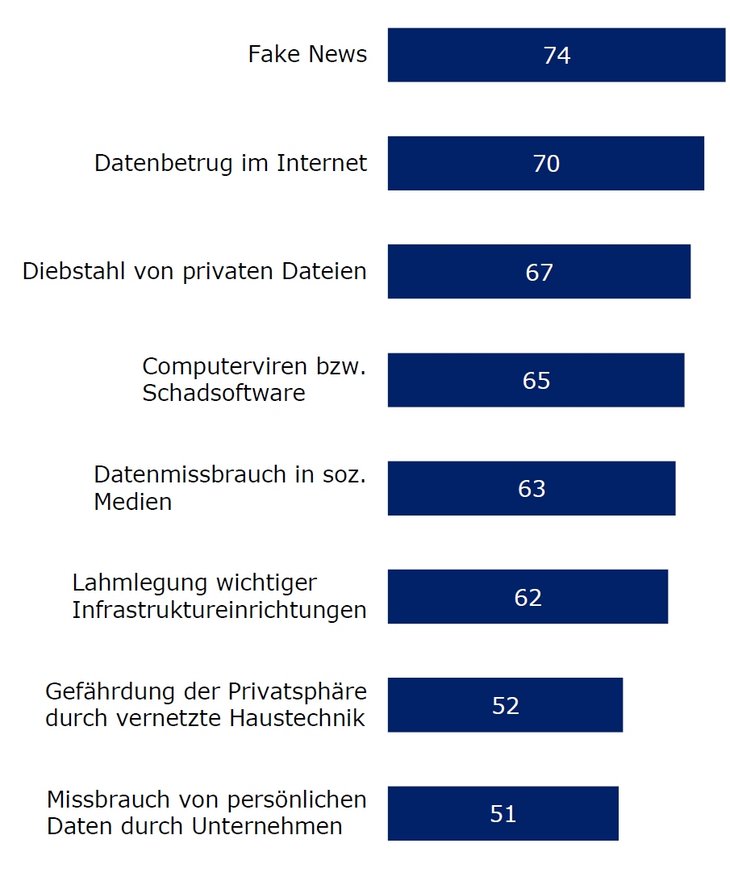 Das Thema "Fake News" beherrscht heute die Schlagzeilen und ist so drängend, dass es 2019 erstmals den Sprung auf den unrühmlichen "Platz 1" der Liste der wichtigsten Cyber-Risiken geschafft hat – sicherlich eines der aufsehenerregendsten Ergebnisse der Studie. Beachtliche 74 Prozent der Entscheider aus Wirtschaft und Politik halten diese unlautere Beeinflussung für ein "großes Risiko" für die Menschen in Deutschland, und zwar noch vor "klassischeren" Cyber Crimes wie Datenbetrug im Internet (70 Prozent), Diebstahl privater Daten bzw. Informationen durch Cyber-Angriffe (67 Prozent) oder Computerviren und Schadsoftware (65 Prozent). Bei der allgemeinen Risikoeinschätzung bewerten dabei Unternehmensvertreter viele Gefahren noch deutlich höher als Politiker, zum Beispiel Datenbetrug im Internet (73 Prozent gegenüber 58 Prozent) oder Eingriffe in die Privatsphäre von Bürgern durch vernetzte Haustechnik (55 Prozent gegenüber 43 Prozent).