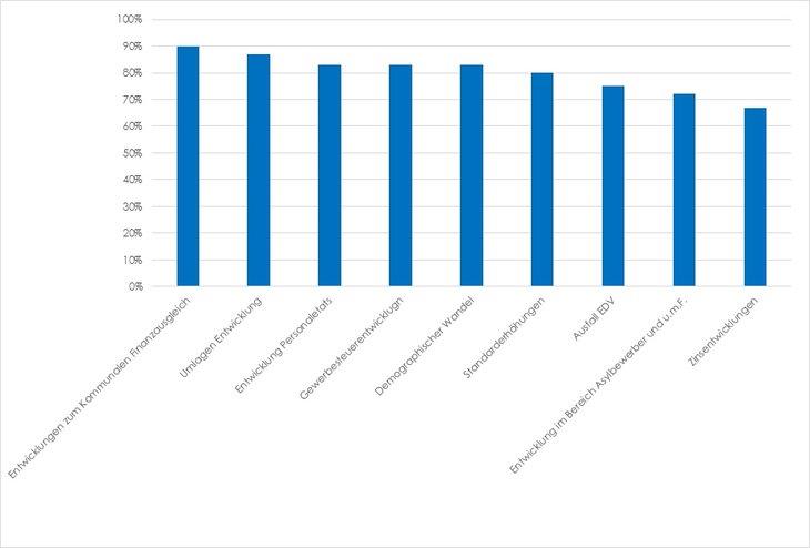 Im Kontext der Umfrage wurden auch die aktuellen Top-10-Risiken in deutschen Gemeinden ermittelt. Nahezu alle Befragten (90 Prozent) stimmten überein, dass Entwicklungen zum kommunalen Finanzausgleich die Zielerreichung der Organisation am meisten gefährdet. Dicht gefolgt vom Risiko Umlagen Entwicklungen (87 Prozent). Im Mittleren Bereich der Top 10 Risiken befinden sich Standarderhöhungen (80 Prozent) und Ausfall von EDV (75 Prozent). Des Weiteren befürchten viele Gemeinden das Zinsentwicklungen (67 Prozent) die Zielerreichung gefährden kann. Im Übrigen wurden Risiken die es nicht in die Top-10-Liste geschafft haben auch von mehr als der Hälfte der Befragten als essentielles Risiko erkannt. Zum Beispiel identifizierten 59 Prozent Eintritt einer Kindeswohlgefährdung als Risiko. Weiterhin fällt auf, dass bei den Top-10-Risiken alle Risiken primär finanzielle Folgen haben. Risiken, wie zum Beispiel Eintritt eines Schadensereignisses bei Veranstaltungen wurden von nur 28 Prozent als zielsetzungsgefährdend angesehen.