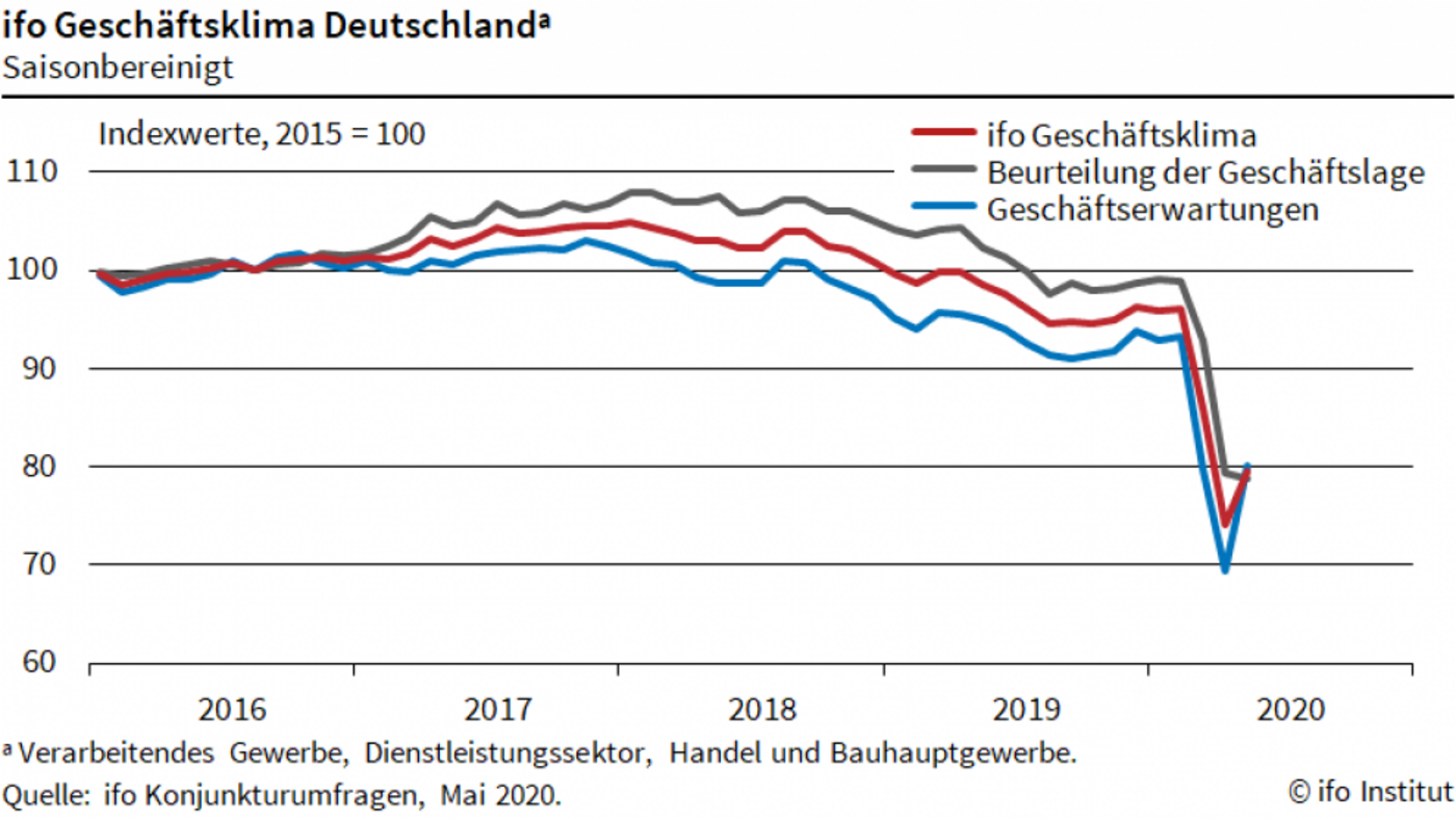 Die Stimmung unter den deutschen Unternehmen hat sich nach den katastrophalen Vormonaten etwas erholt. Der ifo Geschäftsklimaindex ist im Mai auf 79,5 Punkte gestiegen, nach 74,2 Punkten im April. Die aktuelle Lage beurteilten die Unternehmen zwar nochmals etwas schlechter. Jedoch verbesserten sich ihre Erwartungen für die kommenden Monate deutlich. Trotzdem erwartet ein Großteil der Unternehmen noch immer eine Verschlechterung der Geschäftslage. Die ersten Lockerungen sorgen für einen Hoffnungsschimmer.