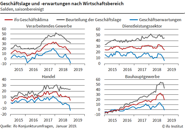In den deutschen Chefetagen wächst die Unruhe. Der ifo Geschäftsklimaindex ist im Januar auf 99,1 Punkte gefallen, nach 101,0 Punkten im Dezember. Das ist der niedrigste Wert seit Februar 2016. Die aktuelle Geschäftslage wurde etwas weniger gut beurteilt. Die Erwartungen haben sich sogar massiv verschlechtert. Sie sind erstmals seit Dezember 2012 leicht pessimistisch. Die deutsche Wirtschaft befindet sich in einem Abschwung.