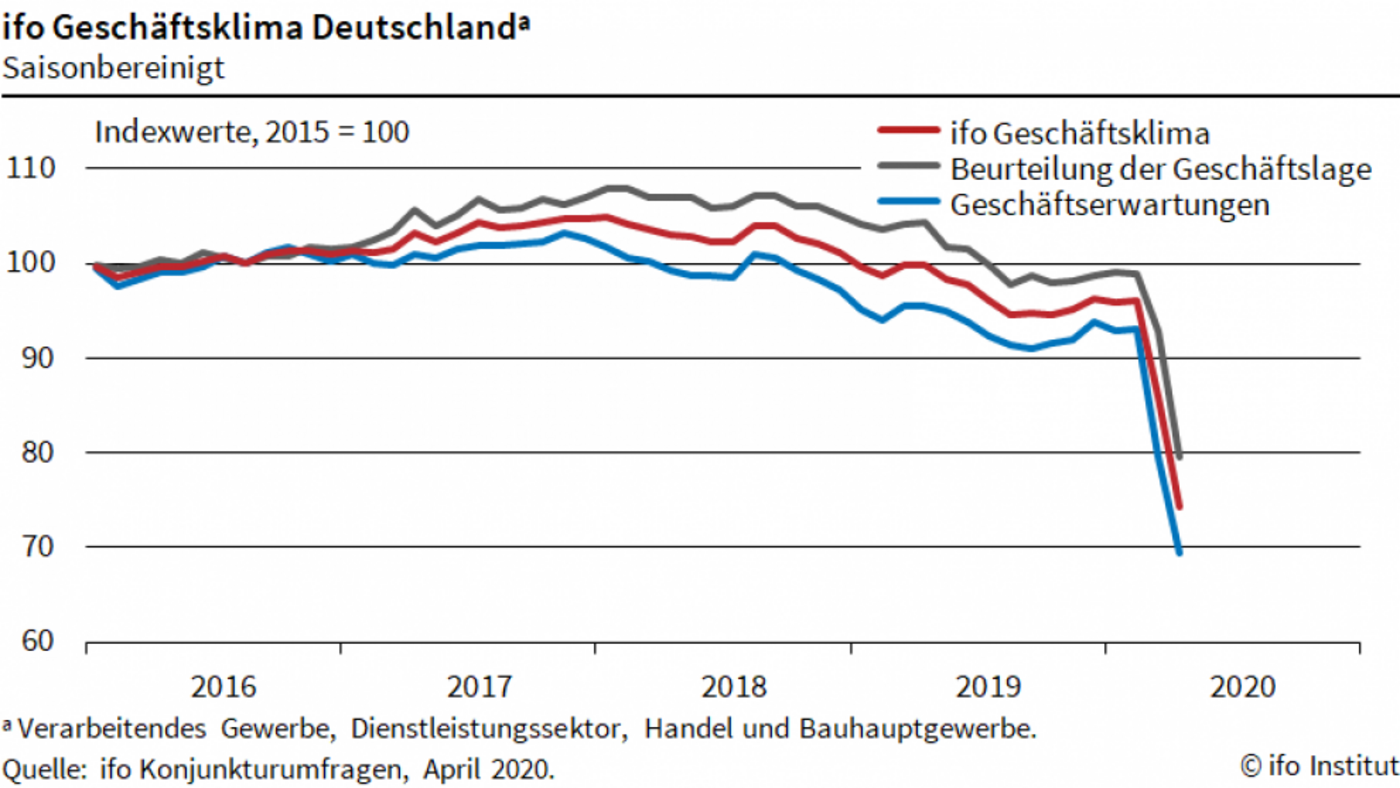 "Trotz der eingeleiteten Lockerungen ist das gesellschaftliche und wirtschaftliche Leben in Deutschland nach wie vor weit von einem Zustand entfernt, der bislang als normal angesehen wurde", so die Expertinnen und Experten. Die verfügbaren Konjunkturindikatoren wie der ifo-Geschäftsklimaindex oder der GfK-Konsumklimaindex zeichneten ein dementsprechend düsteres Bild. Der ifo Geschäftsklimaindex ist im April auf 74,3 Punkte abgestürzt, nach 85,9 Punkten im März (siehe Abb. 02 unten). Dies ist der niedrigste jemals gemessene Wert. Einen stärkeren Rückgang hat es in der Geschichte des ifo-index noch nicht gegeben. Auch der GfK- Konsumklimaindex (siehe Abb. 01 unten) stürzte für Mai 2020 auf einen historischen Tiefstand von -23,4 Punkten und damit 25,7 Punkte weniger als im April dieses Jahres. Die allgemeine Verunsicherung der Bürger hat dazu geführt, dass die Sparneigung im April um mehr als 51 Punkte angestiegen ist und das Konsumklima erheblich belastet. Während die Konjunkturaussichten aktuell angesichts der Schwere der Krise noch glimpflich davonkommen, muss die Einkommenserwartung einen beispiellosen Absturz hinnehmen. Der Indikator verliert gegenüber dem Vormonat 47,1 Zähler und fällt auf -19,3 Punkte. Noch niemals seit Beginn der monatlichen Erhebung zur Verbraucherstimmung im Jahre 1980 wurde ein höherer Monatsverlust der Einkommenserwartung gemessen. Die Verunsicherung unter den Konsumenten ist derzeit riesig. Neben den bereits tatsächlich stattfindenden Einkommenseinbußen ist die Angst vor Jobverlust bei vielen Beschäftigten stark gestiegen, so die GfK-Analysten.