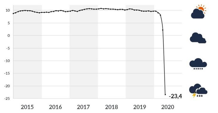 Im ersten Quartal sei die Arbeitslosigkeit saisonbereinigt weitgehend unverändert gewesen, die Meldetermine hätten aber auch vor Einführung der weitreichenden Kontaktbeschränkungen gelegen. Im April stieg die Arbeitslosigkeit saisonbereinigt sprunghaft gegenüber dem Vormonat um 373.000 Personen auf 2,64 Millionen an. Damit habe sich die Arbeitslosenquote um 0,8 Prozentpunkte auf 5,8 Prozent erhöht. Auch für die nächsten Monate sind die Aussichten für den Arbeitsmarkt gemäß den Frühindikatoren schlecht.