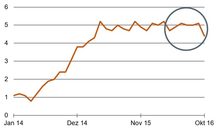 Nun kam der starke Rückgang der Wachstumsrate im Oktober (siehe Grafik). Er kann natürlich ein einmaliger Ausreißer sein. Dann muss man sich nicht weiter darum kümmern. Ich vermute aber, dass mehr dahintersteckt. Deshalb muss man es ernst nehmen. Wenn das Wachstum der Geldmenge zurückgeht, ist das häufig ein Zeichen, dass in der Wirtschaft nicht alles glatt läuft.