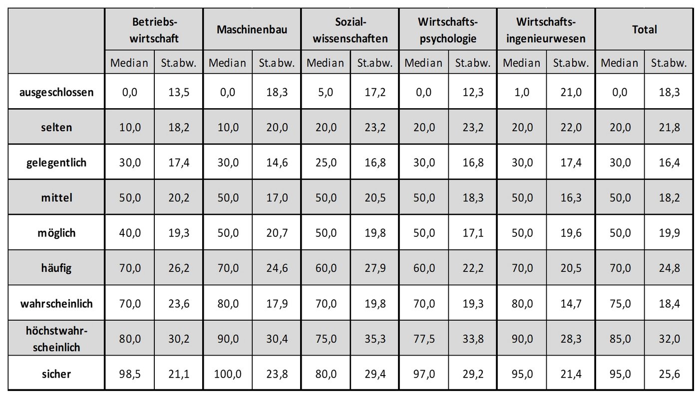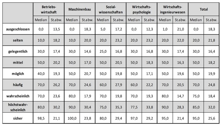 Der Median-Test zeigte hier für alle Begriffe außer möglich, mittel und gelegentlich signifikante Unterschiede zwischen den Gruppen. Post-hoc-Tests zeigten anschließend signifikante Unterschiede zwischen den Studierenden der Sozialwissenschaften und Maschinenbau für die Begriffe ausgeschlossen, wahrscheinlich, sicher, höchstwahrscheinlich, selten. Weiter gab es signifikante Unterschiede zwischen den Studierenden der Sozialwissenschaften und des Wirtschaftsingenieurwesens für wahrscheinlich, sicher, häufig und höchstwahrscheinlich. Dieser Effekt ist auch nicht auf Unterschiede in der Note im Fach Mathematik oder der Abschlussnote zurückzuführen, auch wenn Studierende im Maschinenbau und Wirtschaftsingenieurwesen sowohl deutlich bessere Mathematiknoten (Median 2,0 vs. 3,0) als auch Abschlussnoten (2,0 für Maschinenbau bzw. 1,8 für Wirtschaftsingenieurwesen vs. 2,7 für Sozialwissenschaften) aufweisen.