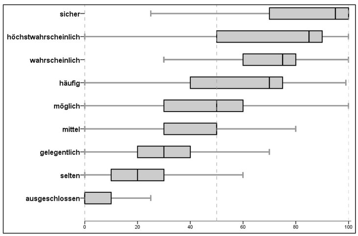 Sehen wir uns die Ergebnisse etwas genauer an, fällt vor allem bei den sprachlich eindeutigen Begriffen sicher und ausgeschlossen auf, dass auch diese von den Befragten nicht eindeutig einer Wahrscheinlichkeit zugeordnet werden, auch wenn die Begriffe eindeutig erscheinen. So sollte semantisch erwartet werden, dass ausgeschlossen 0 % bedeutet und sicher 100%.