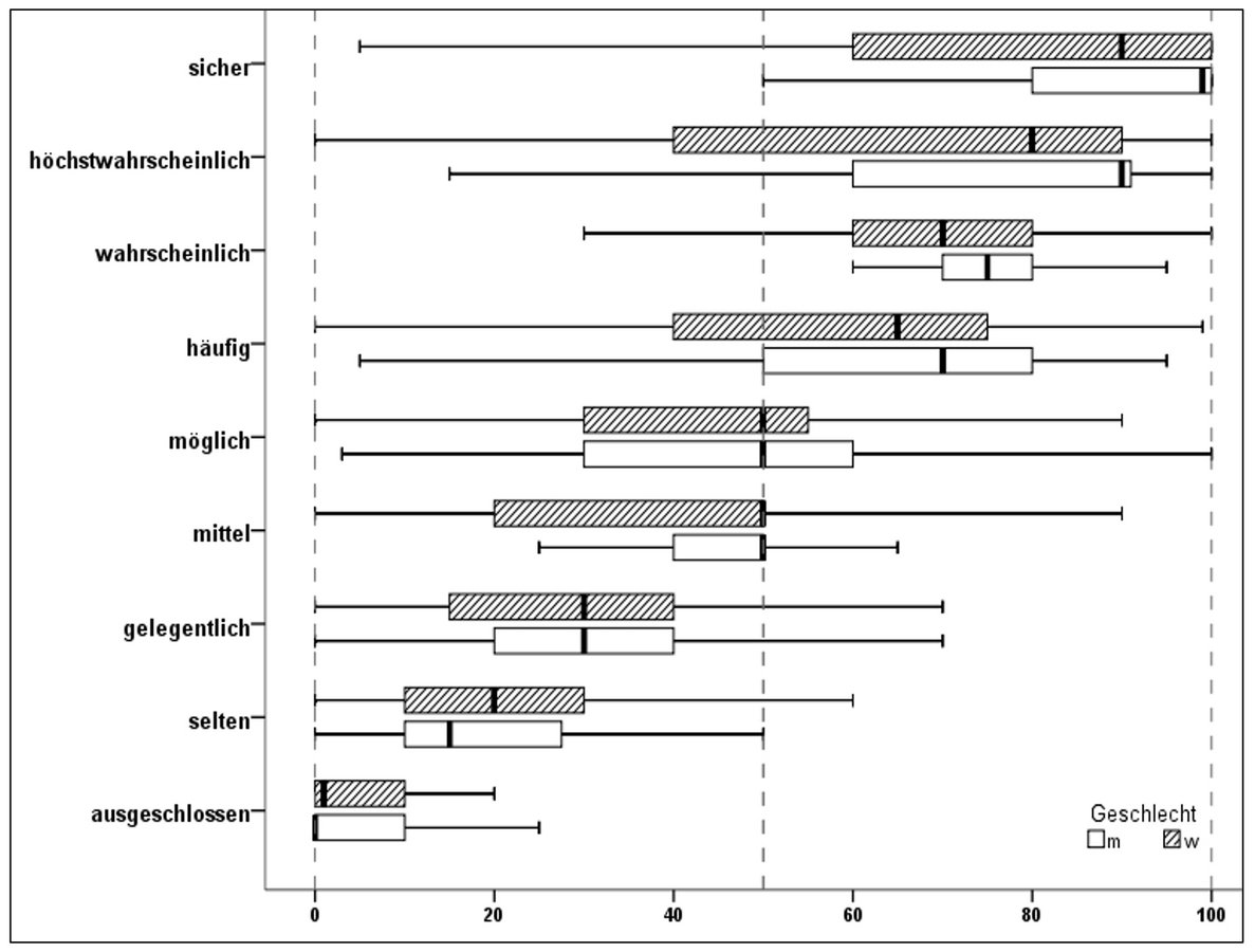 Auffällig ist auch der Vergleich der Angaben getrennt nach Geschlechtern (vgl. Abb. 03). In den meisten Fällen liegen die Mediane weit auseinander, außer bei den Begriffen möglich, mittel und gelegentlich.
