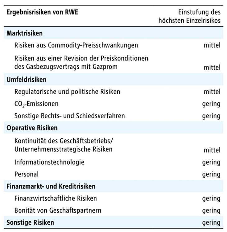 In der Kommunikation über Risiken werden häufig Begriffe zur Klassifizierung der einzelnen Risiken verwendet. Dies wird als Ergänzung zu den quantitativen Angaben oder bei rein qualitativ beschriebenen Risiken auch als alleinige Angabe zur Bewertung eines Risikos genutzt. Solche Begriffe zur Kategorisierung werden entweder in Bezug zur Eintrittswahrscheinlichkeit (beispielsweise "hoch") bei ereignisorientierten Risiken wie Bränden oder zur Einschätzung der Auswirkungen eines Risikos (beispielsweise "existenzbedrohend"), beispielsweise zur Abschätzung der Relevanz eines Risikos benutzt (siehe hierzu den Prüfungsstandard 981 des Instituts der Wirtschaftsprüfer, A25, zu den typischen Herausforderungen der Risikoquantifizierung siehe Gleißner 2017, S. 167ff.). In Abb. 01 ist dazu ein typisches Beispiel aus dem Geschäftsbericht von RWE aufgeführt.
