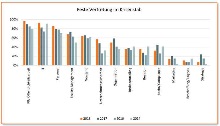 IT und PR/ Öffentlichkeitsarbeit sind die am häufigsten fest im Krisenstab vertretenen Bereiche (siehe Abb. 02). Dies ist auf deren Bedeutung und Aufgabe in einer digitalisierten und medial vernetzten Welt zurückzuführen.