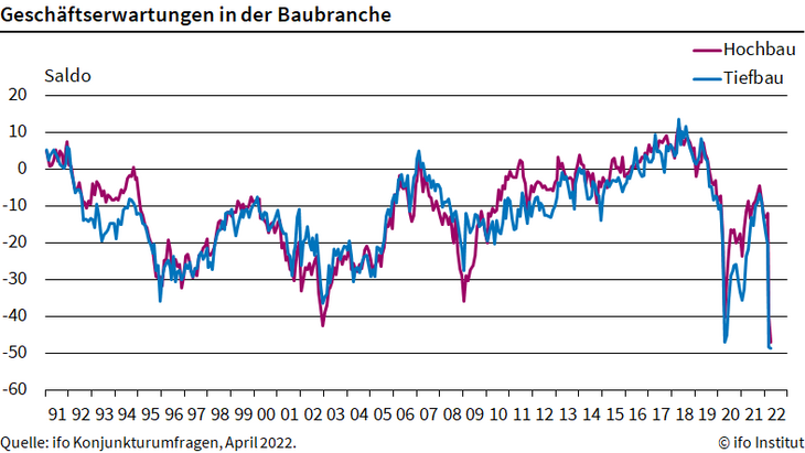 "Bei laufenden Projekten stellt sich die Frage, inwieweit Kostensteigerungen weitergegeben werden können. Neue Projekte sind kaum kalkulierbar. Auf der anderen Seite steigen für Bauherren die Zinsen für die Finanzierung", sagt Leiss weiter. Daher kommt es bereits zu mehr Auftragsstornierungen, wie die ifo-Umfrage weiter zeigt. Im April meldeten das 7,5 Prozent der Hochbauer, nach 4,6 Prozent im März. Bei den Tiefbauern beklagten 9,3 Prozent Stornos, im März waren es nur 3,9 Prozent.