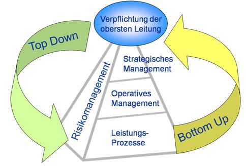 Der Top-down-Ansatz ist das Anliegen von Corporate Governance. Alle bekannten Codices (OECD, DE, AT, CH, usw.) bezeichnen das Risikomanagement als eine der wichtigsten Aufgaben der obersten Leitung. Aufsichtsrat, Verwaltungsrat und Management müssen sich fortlaufend mit den wesentlichen Risiken der Organisation befassen und Massnahmen treffen, um diese zu kennen, zu verstehen und nach Möglichkeit zu bewältigen. Dies kann nur verantwortungsvoll erfolgen, wenn die Stakeholder in die Risikodiskussion einbezogen werden.