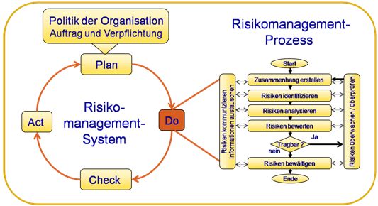 Teil des systemischen Ansatzes ist der Risikomanagement-Prozess. Er liefert das Vorgehen, um die Risiken zu erkennen, zu analysieren, zu bewerten und zu bewältigen. Der Prozess ist begleitet von Kommunikation und Informationsaustausch einerseits, von Überwachung und Überprüfung der Risiken andererseits.