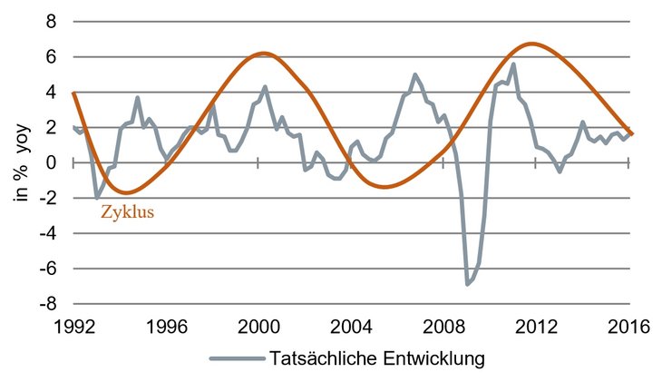 Zyklische Muster waren in der Vergangenheit als heuristisches Analyseinstrument immer hilfreich und wichtig. Natürlich dürfen sie nicht überschätzt werden. Auf- und Abschwünge in der wirtschaftlichen Entwicklung verlaufen in der Praxis nicht immer so exakt, wie man sich das im Lehrbuch vorstellt. Sie dauern manchmal etwas länger, manchmal etwas kürzer. Sie entsprechen auch nicht immer der bekannten Sinuskurve. Sie werden häufig durch externe Einflüsse verzerrt.