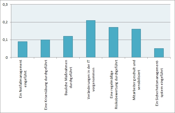 Nur 17 Prozent der Befragten Geschäftsführer stellen die eigene Risikobewertung als die umfangreichste Maßnahme zum Schutz der eigenen Organisation der vergangenen drei Jahre dar. Im Klartext heißt das: Die Mehrheit der mittelständischen Unternehmen verfügt bisher über kein strukturiertes Managementsystem zum Schutz vor Risiken.