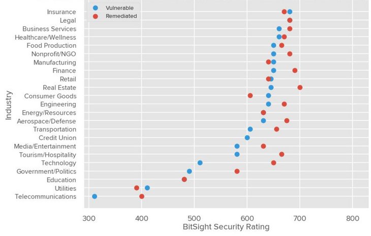 Abb. 03: Median Security Rating of Vulnerable and Remediated Companies by Industry [Quelle: BitSight]Abb. 03: Median Security Rating of Vulnerable and Remediated Companies by Industry [Quelle: BitSight]